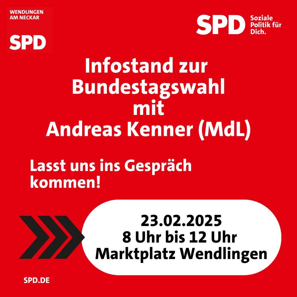 Am Samstag, den 22. Februar ist der SPD Ortsverein Wendlingen am Neckar wieder von 8:00 bis 12:00 Uhr mit einem Infostand auf dem Marktplatz vertreten. Der SPD Landtagsabgeordnete Andreas Kenner hat dazu seinen Besuch angekündigt.