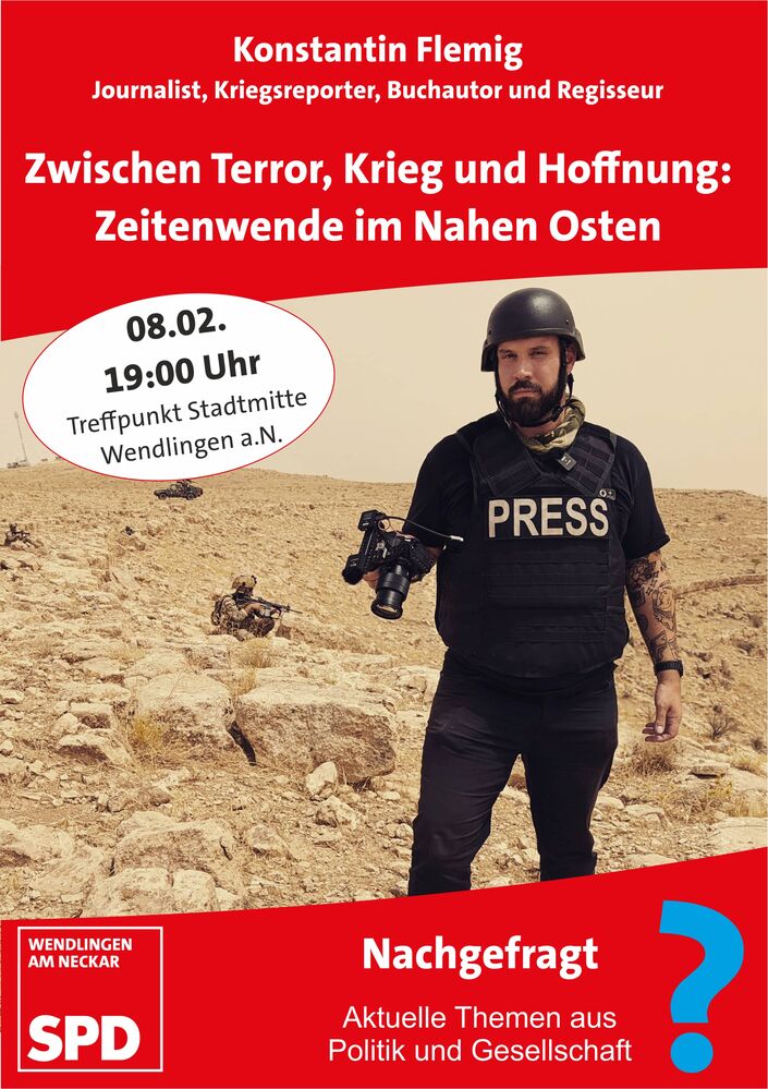 Der SPD-Ortsverein Wendlingen am Neckar lädt zu einem hochaktuellen Vortrag ein: Am 08.02.2025 wird der Journalist und Nahostexperte Konstantin Flemig in Wendlingen zu Gast sein. Unter dem Titel „Zwischen Terror, Krieg und Hoffnung: Zeitenwende im Nahen Osten“ beleuchtet Flemig die aktuellen Entwicklungen in der Region und gibt Einblicke in Zusammenhänge der komplexen geopolitischen Lage.